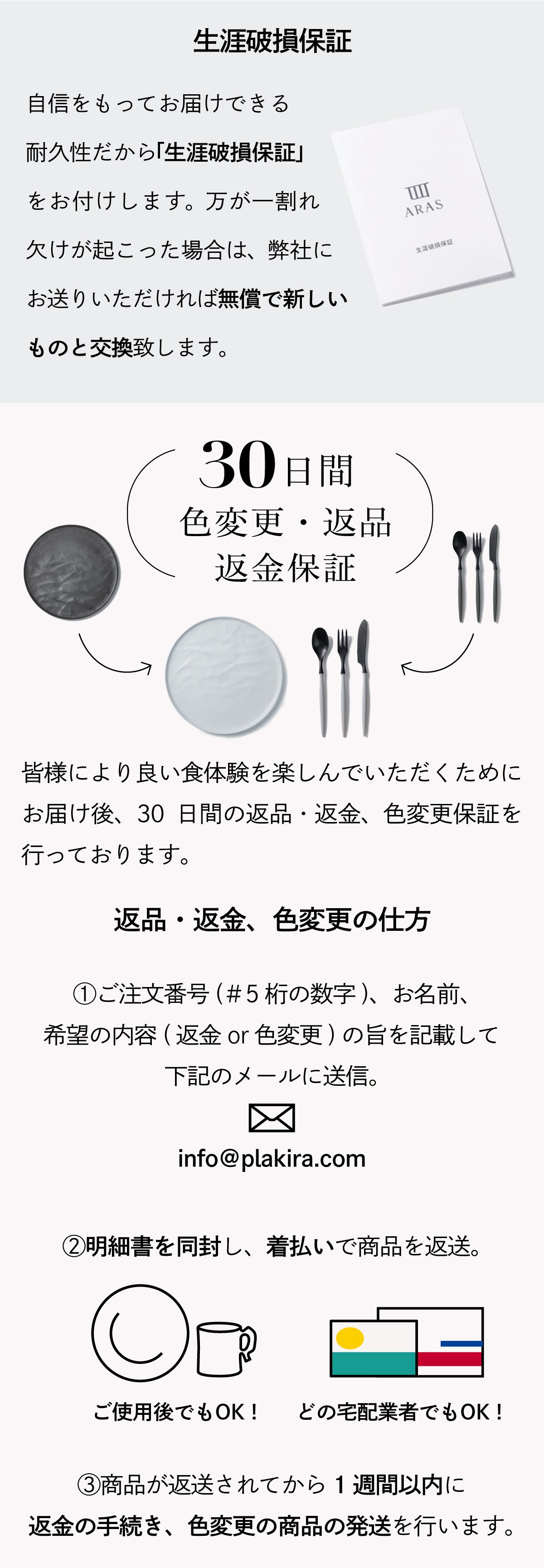 - ARASのカトラリーやマグカップは口元の薄さが特徴となっております。強い力をかけたり、噛んだりした場合に破損する可能性がございます。特に小さなお子様のご使用時などは十分にご注意ください。