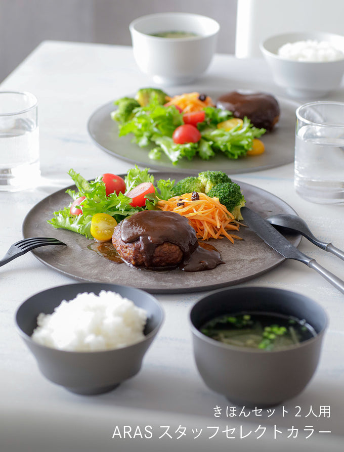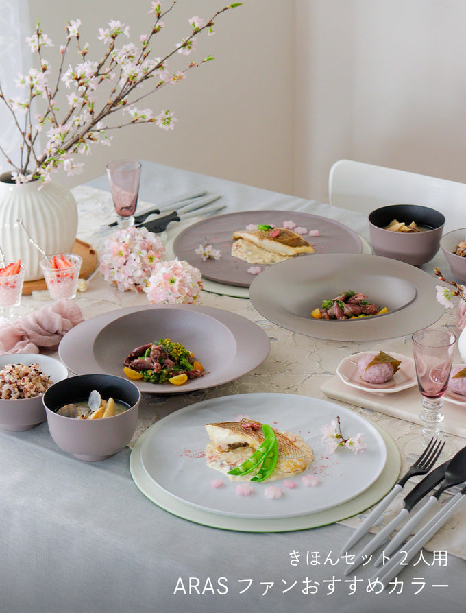 <春うらら祭り限定>きほんセット2人用 (大皿ウェーブ・深皿スクープ・どんぶり鉢・お茶碗・汁椀・スプーン・フォーク・ナイフ・箸 各2)