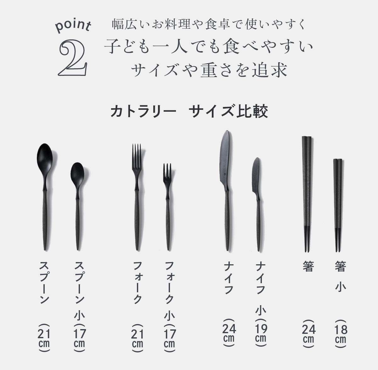 - カトラリーは柄の部分と先端のつなぎ目が構造上、弱い部分になっており力がかかって破損してしまう場合があります。ご使用の際は、つなぎ目部分に力をかけすぎないようご注意ください。