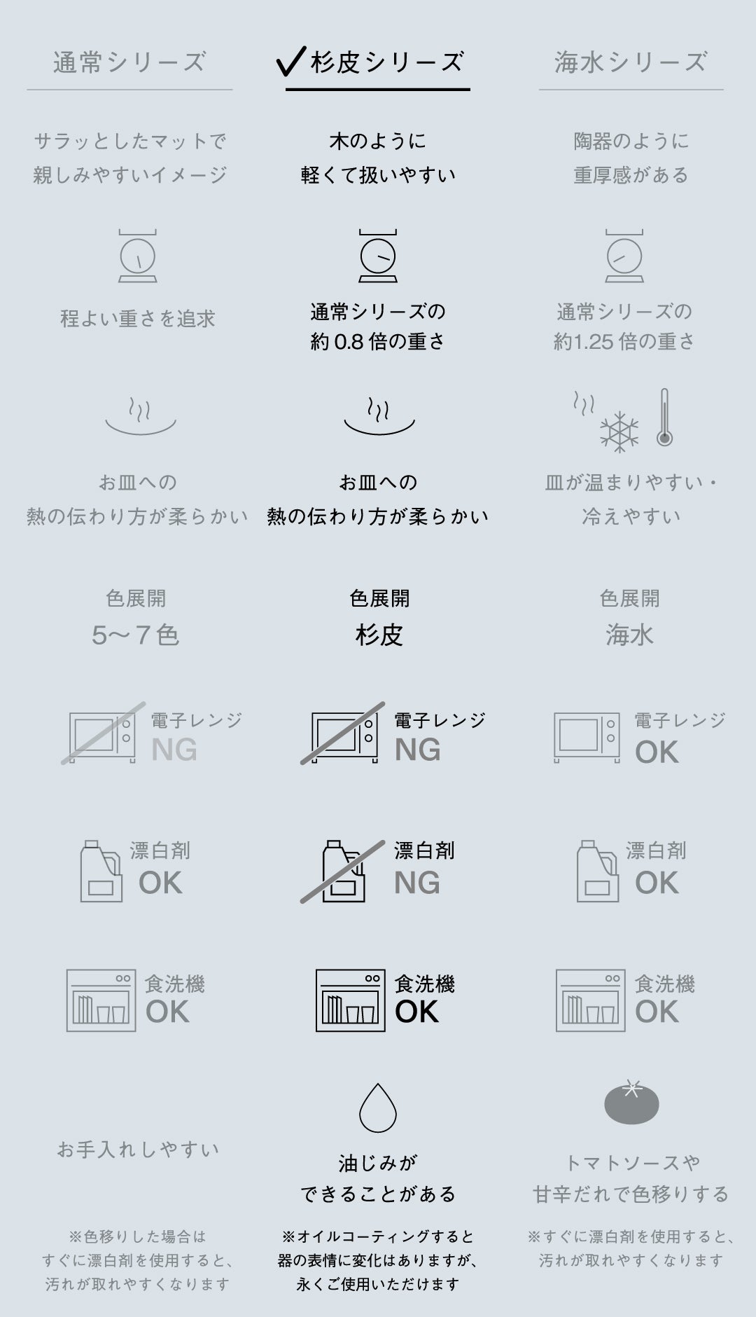 - 永くご使用いただくうえで、形や質感が変化する恐れがあるという観点から、電子レンジは使用不可となっております。