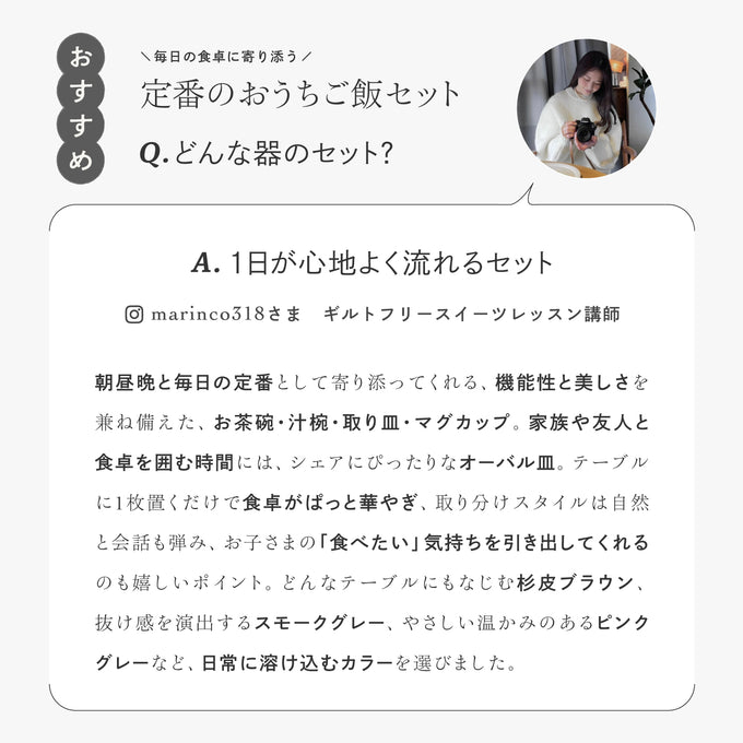 定番のおうちご飯セット(お茶碗、汁椀、マグカップ大、取り皿ボウル、箸 各2 + オーバル皿 1枚)